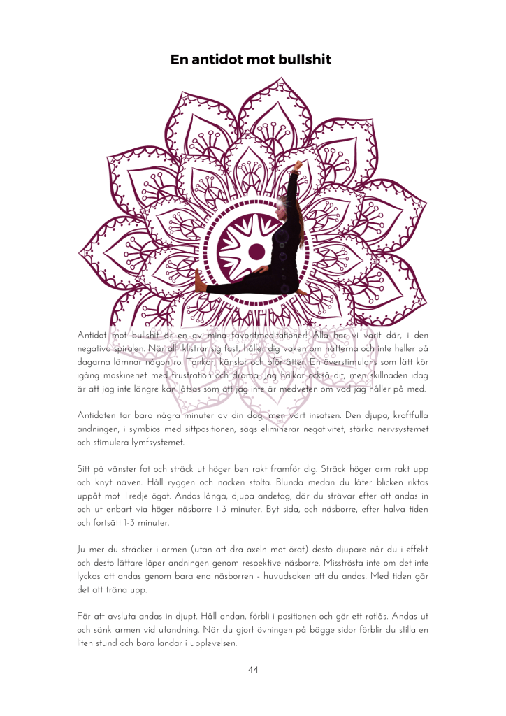 ”Det är tack vare yogan och meditationen, som jag börjat lära känna mig själv och hur jag fungerar på ett djupare plan. När jag insåg på vilket sätt yogan har hjälpt mig, väcktes också idén att sammanställa ett material för dig som kan känna igen dig i högkänslighet, men också för dig som har eller möter högkänsliga i din vardag – och kanske också som en liten navigationskarta för dig som arbetar som yogalärare.”